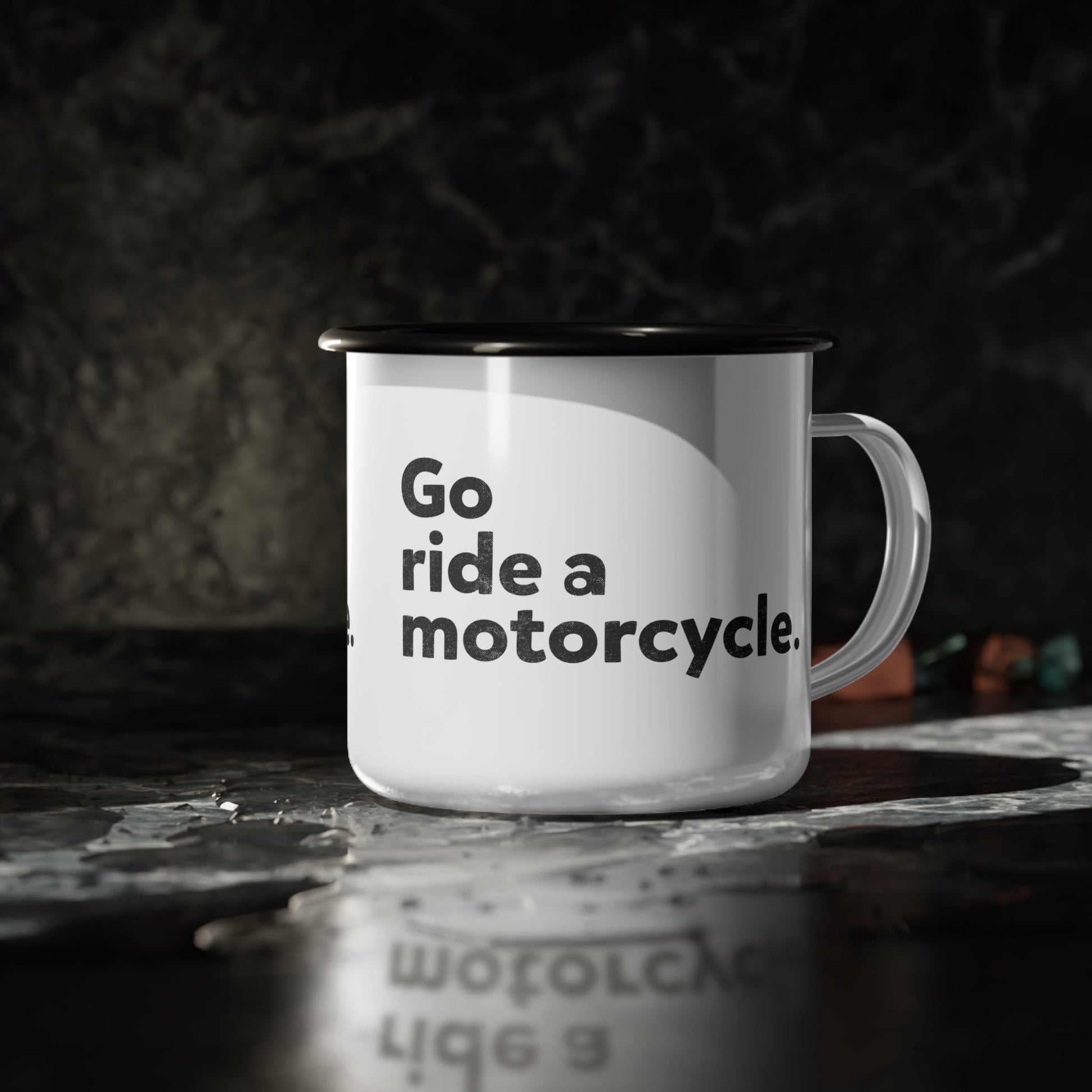 "Go Ride a Motorcycle" Steel Moto Camping Mug. The perfect steel coffee mug for your two-wheeled travels and camping trips. Durable, versatile, and lets everyone know what the priority is, after your morning coffee, of course. Suit up, strap it to your bag and roll out!
