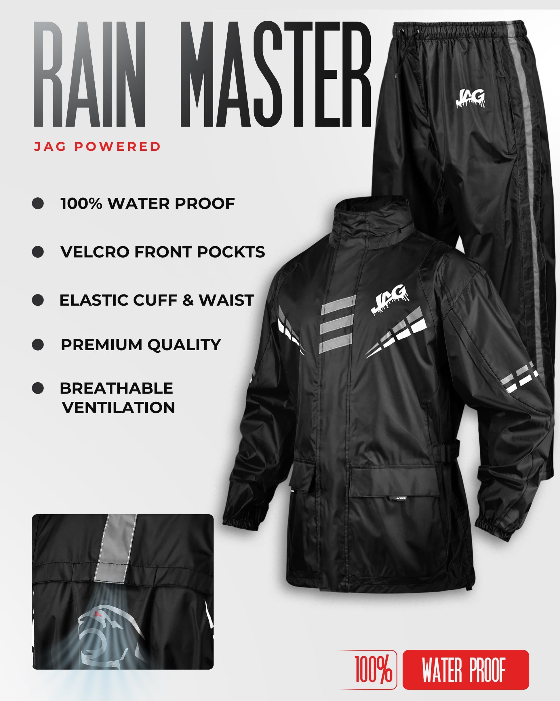 With its sleek design and smart features, the JAG rain suit ensures you stay dry, visible, and comfortable—rain or shine!